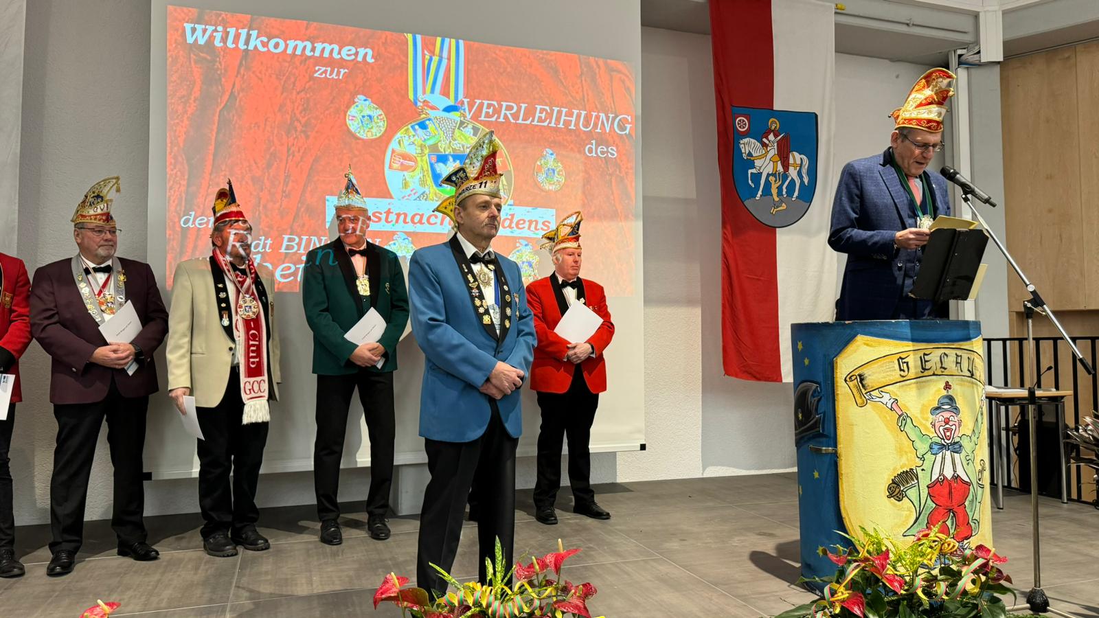Nach dieser närrischen Kundgebung geht es auf direktem Weg zum Kulturzentrum zum närrischen Auftakt zurück. Dort obliegt es nun Oberbürgermeister Thomas Feser, Vereinsvertreter mit dem „närrischen Verdienstorden“ der Stadt Bingen am Rhein auszuzeichnen.